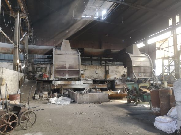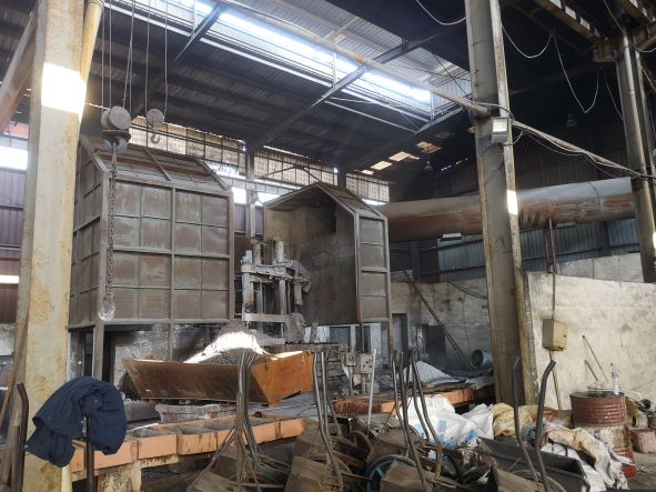 企業廠區設有1幢單層生產廠房、1幢單層倉庫和14層辦公樓。生產廠房共分為2跨,電弧爐熔煉跨和中頻爐熔煉跨。企業主要工藝為電弧爐熔煉、中頻爐熔煉、高溫熔融金屬吊運、水淬制粒等。鎳鐵合金通過熔煉爐熔化后,合金液倒入流槽,流入到水淬池,制成合金顆粒。